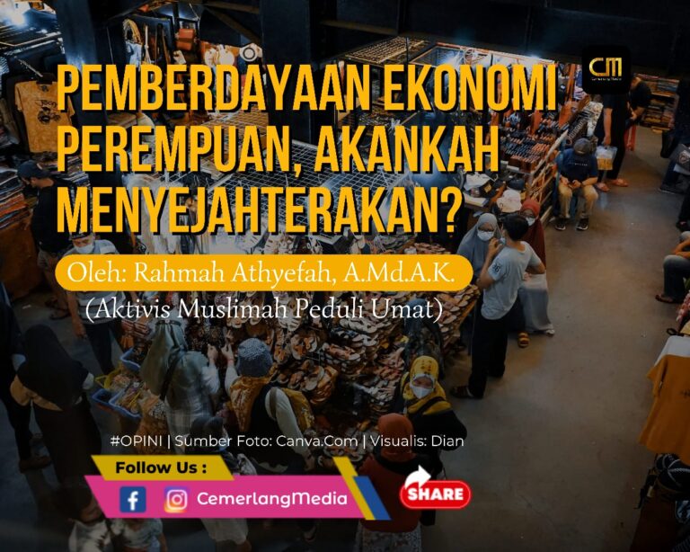 CemerlangMedia.Com — Keterlibatan perempuan dalam memajukan ekonomi makin digenjot oleh pemerintah, terutama sejak terjadinya pandemi. Para perempuan dilibatkan dalam dunia usaha dan makin hari makin diperhitungkan karena mereka dianggap memiliki potensi yang lebih besar dibanding laki-laki dalam banyak jenis pekerjaan. Fakta adanya PHK massal dan terbatasnya aktivitas ekonomi laki-laki sejak pandemi, tak heran banyak pihak menaruh harapan pada perempuan agar bisa membantu pemulihan ekonomi pasca pandemi. Berbagai kebijakan dan program atas nama Pemberdayaan Ekonomi Perempuan (PEP) pun terus diaruskan. Namun, akankah ini mengarahkan masyarakat, khususnya para perempuan pada kesejahteraan yang hakiki?